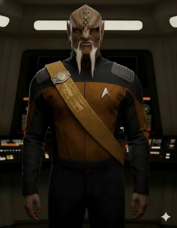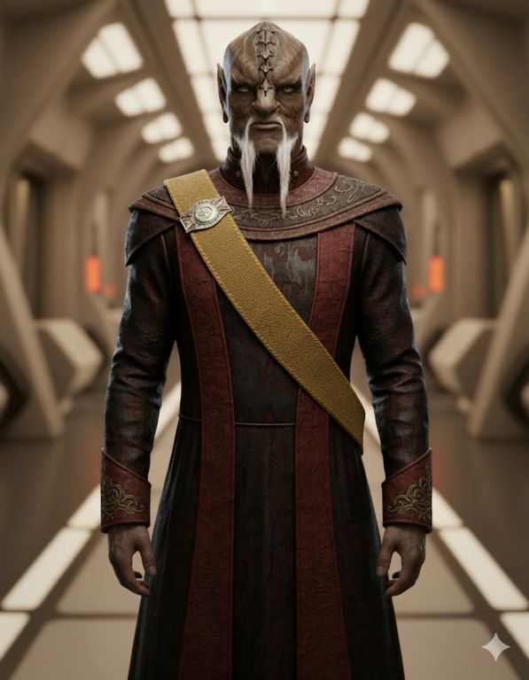 | Physical Description | Karzen looks a bit strange, being part Klingon and part Romulan. There are some strange quirks that seem to be from neither but rather an odd combination of the two. His ears are a bit pointed. Karzen went prematurely bald, while his facial hair went prematurely white. His eyes are an odd white color, but that doesn’t seem to affect his vision, which had to be excellent for him to qualify as a fighter pilot in his youth. Karzen’s forehead ridges go a bit high for a Klingon. In, and sometimes out of uniform, Karzen wears a Klingon mail sash, such as the one Worf wears in uniform. The House symbol on the sash is a combination of his mother’s and father’s houses and this is easily recognized by both Klingons and Romulans, earning Karzen much disdain. He did this on purpose as a way of establishing his own unique identity, and as a way to stick his thumb in the eyes of the people who don’t accept the union of his parents or the fruit of that union. |