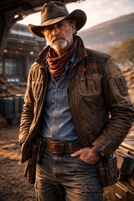 Billdesh Prefau is a man shaped by time and open horizons, broad-shouldered without excess and carrying a quiet, grounded strength. His salt-and-iron-gray hair is worn short and practical, matched by a neatly kept beard that frames a face lined by sun and wind rather than by age alone. Steady blue-gray eyes observe more than they reveal, calm and unhurried, while his movements are economical and deliberate, conserving energy for what matters. He favors understated, functional clothing with subtle futuristic tailoring, giving the impression of someone rooted, resilient, and quietly formidable without ever needing to announce it. |